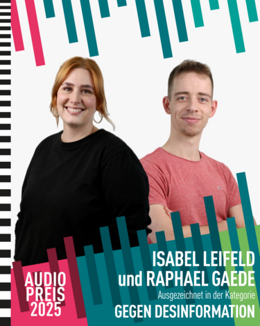 Der Preis „Gegen Desinformation“ geht an Radio Leverkusen: Isabel Leifeld und Raphael Gaede deckten durch investigative Recherche auf, wie das Jugendmagazin LEVolution Jugendliche zu beeinflussen versucht und Verbindungen zu einer vom Verfassungsschutz beobachteten Gruppierung unterhält.